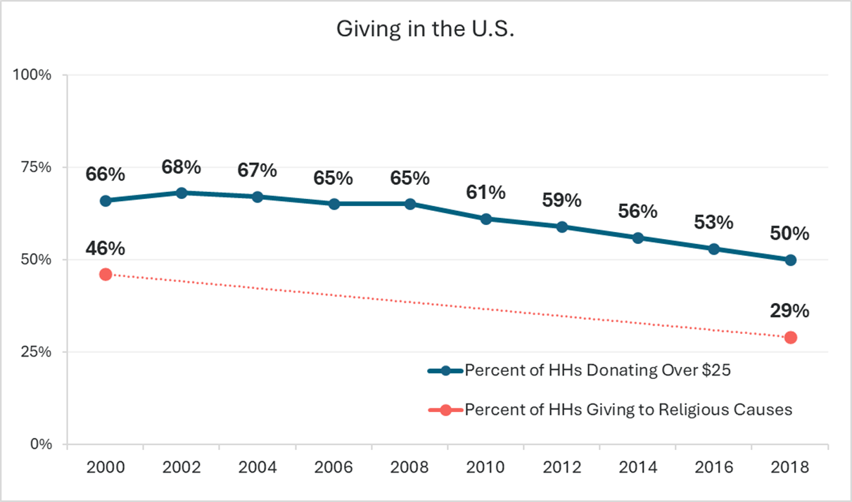 A large portion of the decline in charitable giving stems from fewer people attending and giving to religious institutions. This detail is typically overlooked in charitable giving studies.