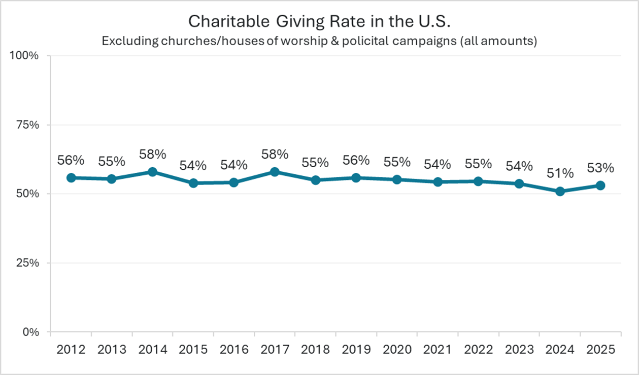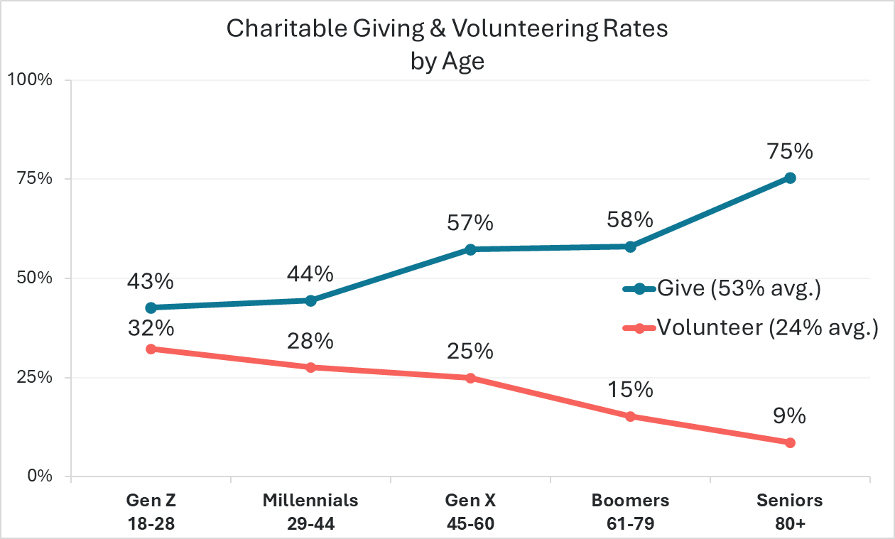 - Generosity is bigger than dollars alone. About a quarter (24%) of U.S. adults volunteer, with participation rising alongside income and declining with age. In addition, newer forms of support, including social advocacy and monetization (engaging with social content to benefit the creator or brand), account for about 12% of preferred giving methods, with higher rates among younger donors.